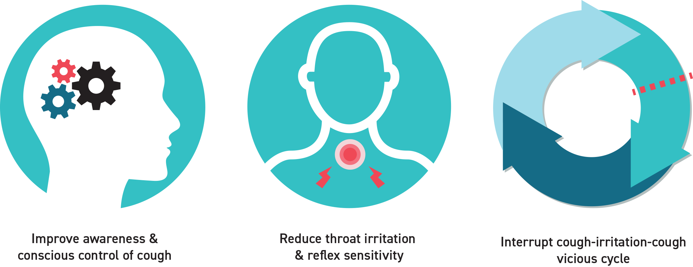 Chronic cough therapy is essentially an airway desensitisation program with supplementary treatment of associated conditions and potential causes, such as inducible laryngeal obstruction, acid or non-acid reflux, and voice disorders. Treatment is non-intrusive and seeks to moderate cough reflex sensitivity by optimising throat/airway hygiene, progressively attenuating the stimulation of cough receptors, and improving both the awareness and control of cough.